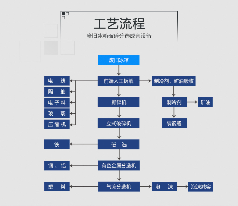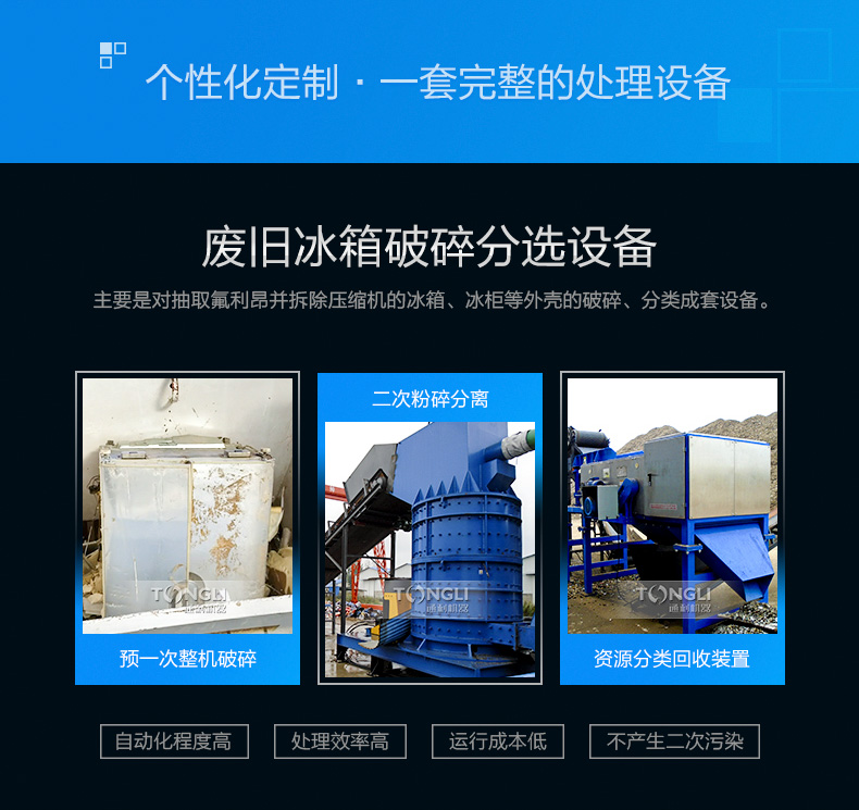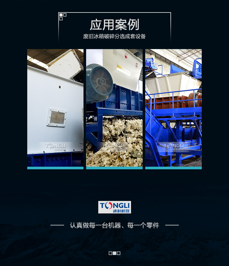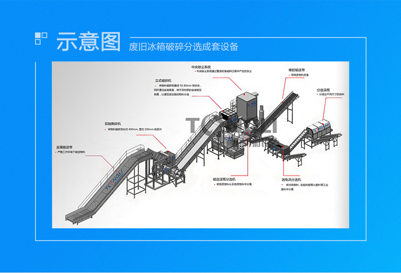 本生產線由重型金屬撕碎機進行粗碎,然后經過立式破碎機進行破碎細化處理。再粉碎過程中采用除塵系統(tǒng)對處理過程中產生的粉塵進行凈化。經過處理的物料通過磁、渦電流、氣流等分設備,分離出來銅、鐵、鋁等可循環(huán)利用的冶煉原料。本系統(tǒng)由PLC控制,操作靈活簡便,具有能耗低、處理量、經濟效益,維護成本低、處理效果等特點。
